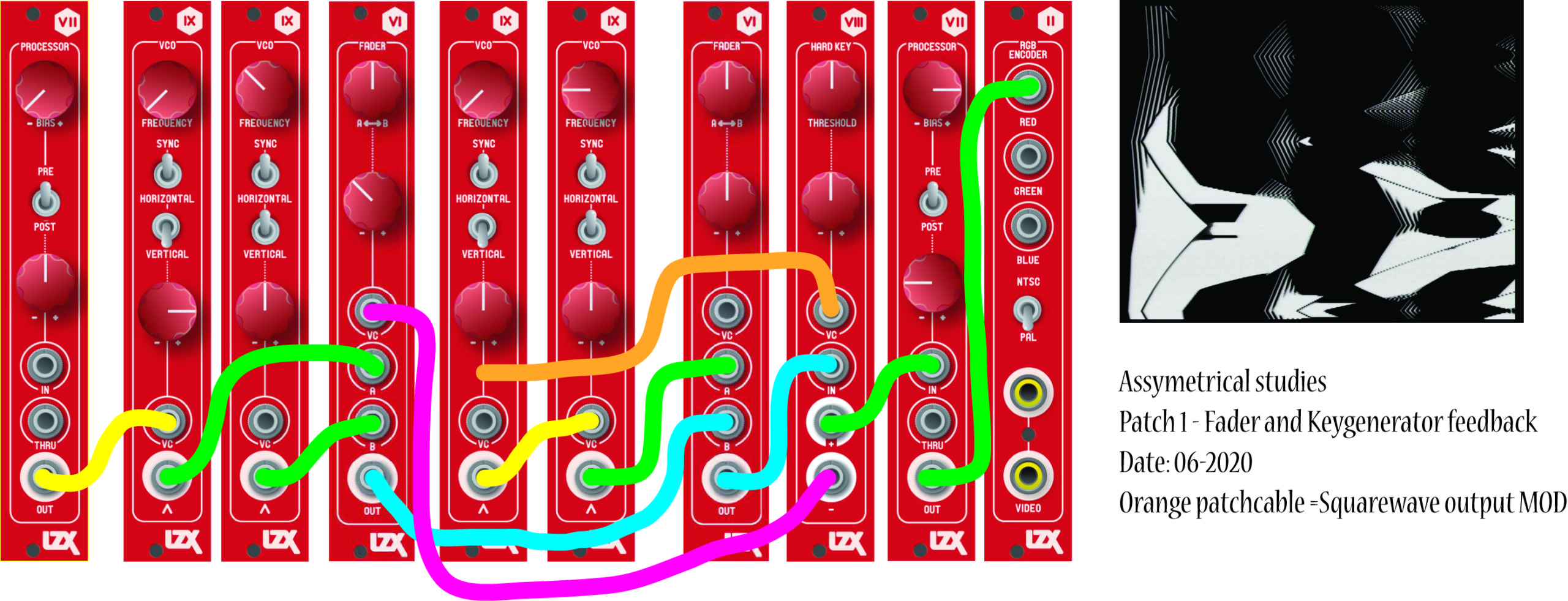 There is some feedback from the Hard Key Generator to the Fader CV input to get those feathery lines at the edges of the shapes. The squarewave output (orange patchcable) adds the thin lines, being patched to the CV input of the second Fader. I use the Processor output to get to lower frequencies of the VCO and as a mixer for the final output.